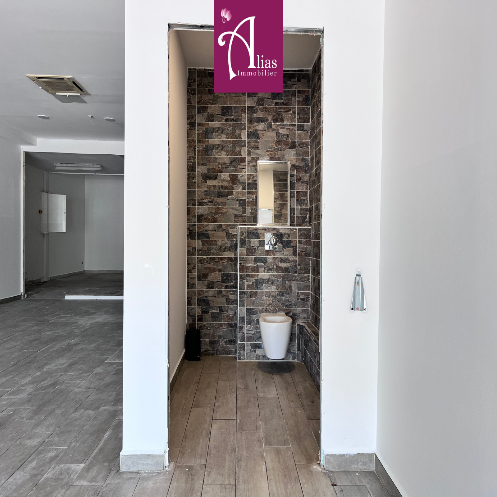 Local en bon état : livré carrelé et peint, avec faux-plafond, électricité, vitrine avec porte à la française et rideau métallique motorisé