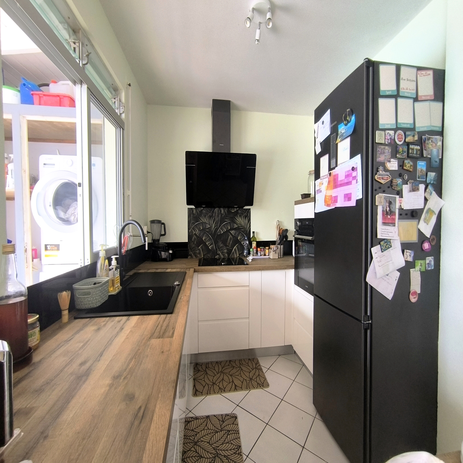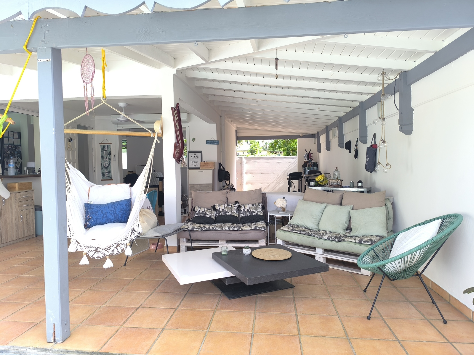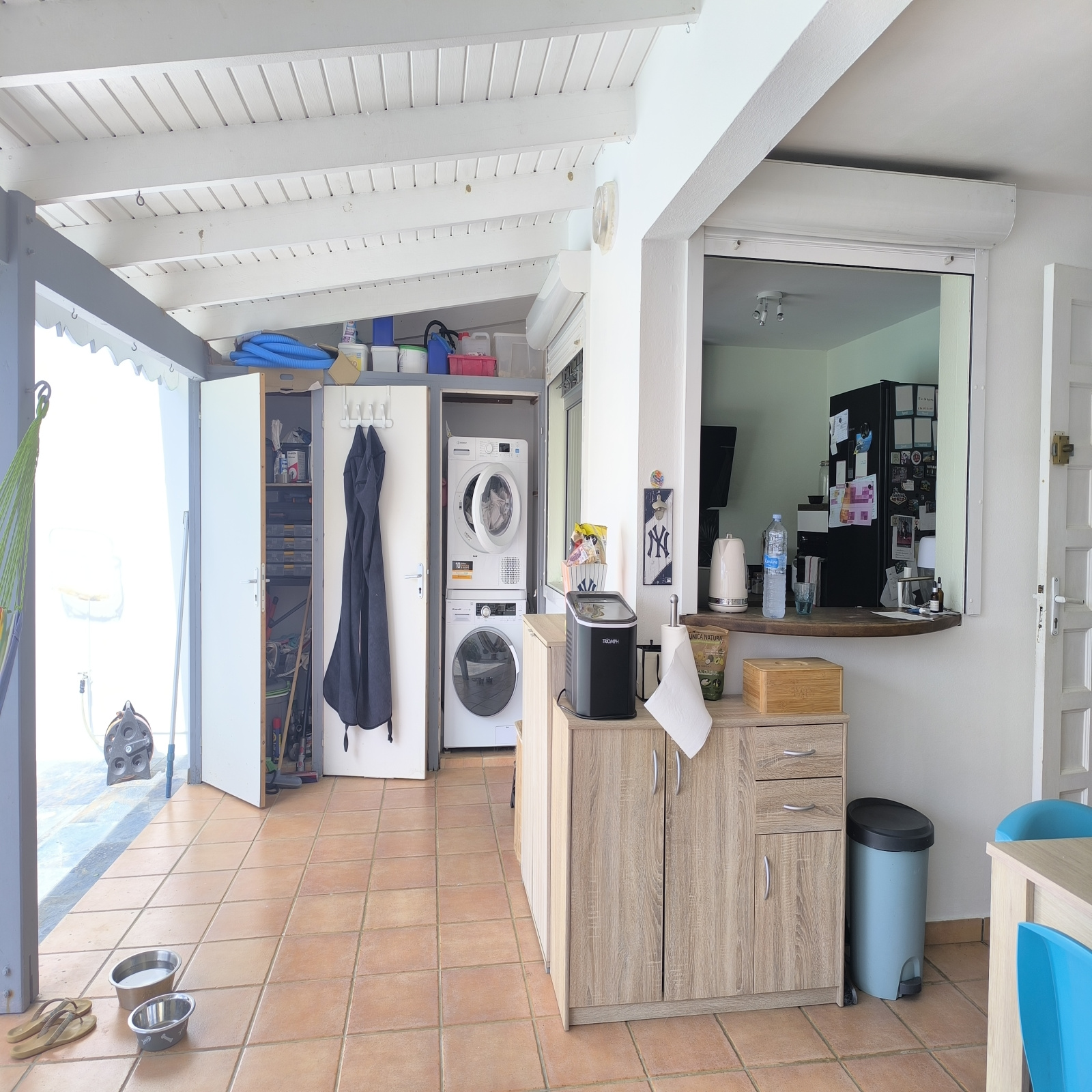 WC invité, grande terrasse couverte de 50 m² avec un espace buanderie discret ( lave-linge, sèche-linge, lave-vaisselle et rangement )