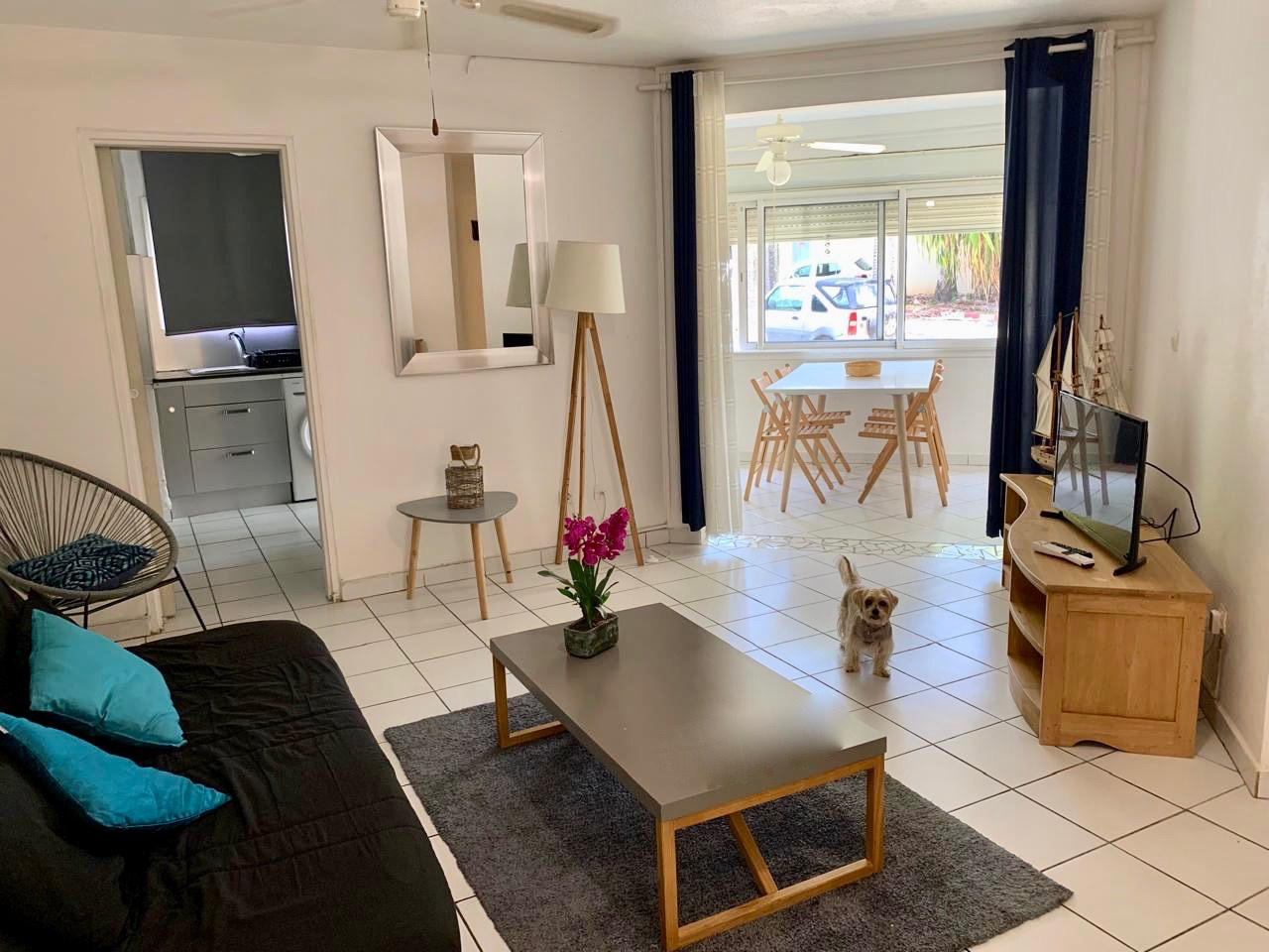Au rez de chaussée avec une vue sur la marina, il dispose d'une kitchenette équipée d'un plaque électrique et d'un frigo, d'une pièce de vie climatisée, et d'une salle d'eau avec WC et machine à laver (installée prochainement).