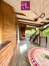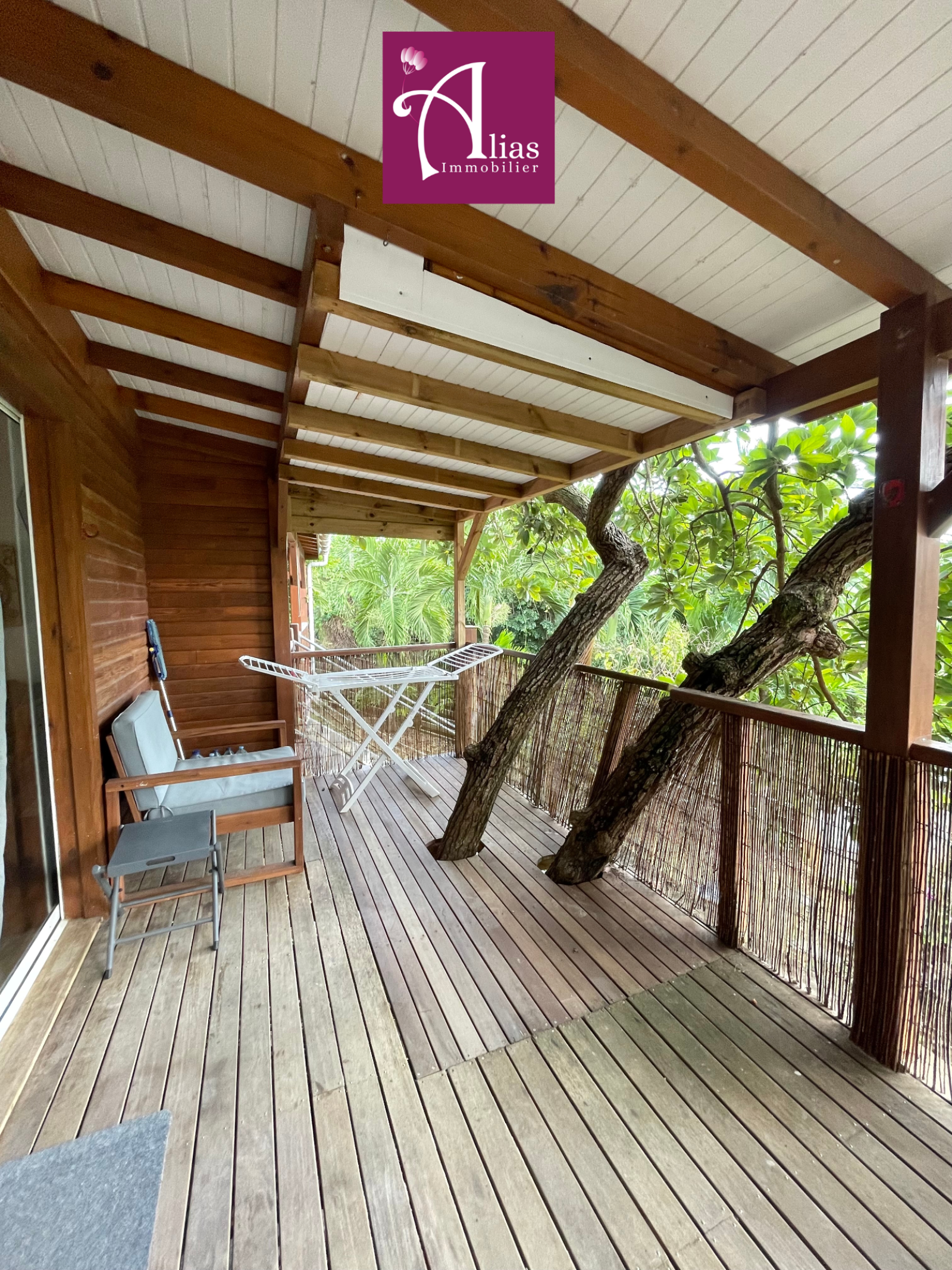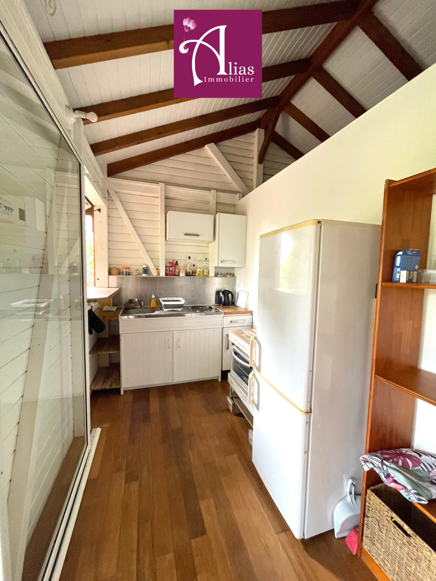 Terrasse en bois couverte, intégrée à la végétation tropicale, Séjour lumineux avec belle hauteur sous plafond et charpente apparente, Cuisine équipée (réfrigérateur, plaques, rangements, électroménager), Chambre climatisée avec ventilateur plafond, Salle d’eau moderne avec douche à l’italienne, Entièrement meublé et prêt à vivre, Stationnement facile, Terrain clos – environnement calme et résidentiel