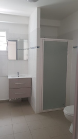 Une grande salle d’eau avec cabine de douche, meuble vasque, WC et placard,