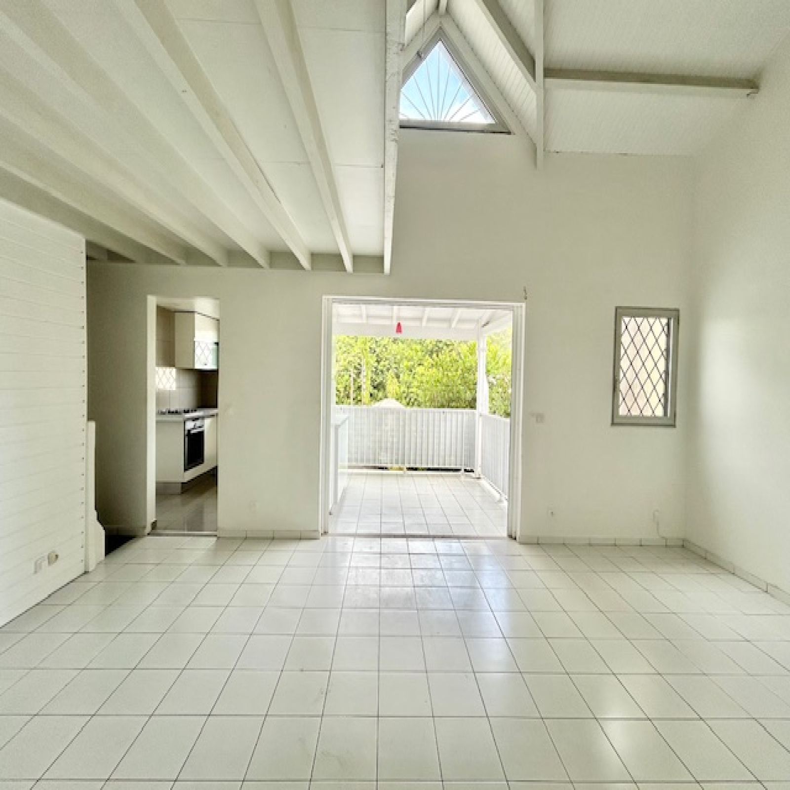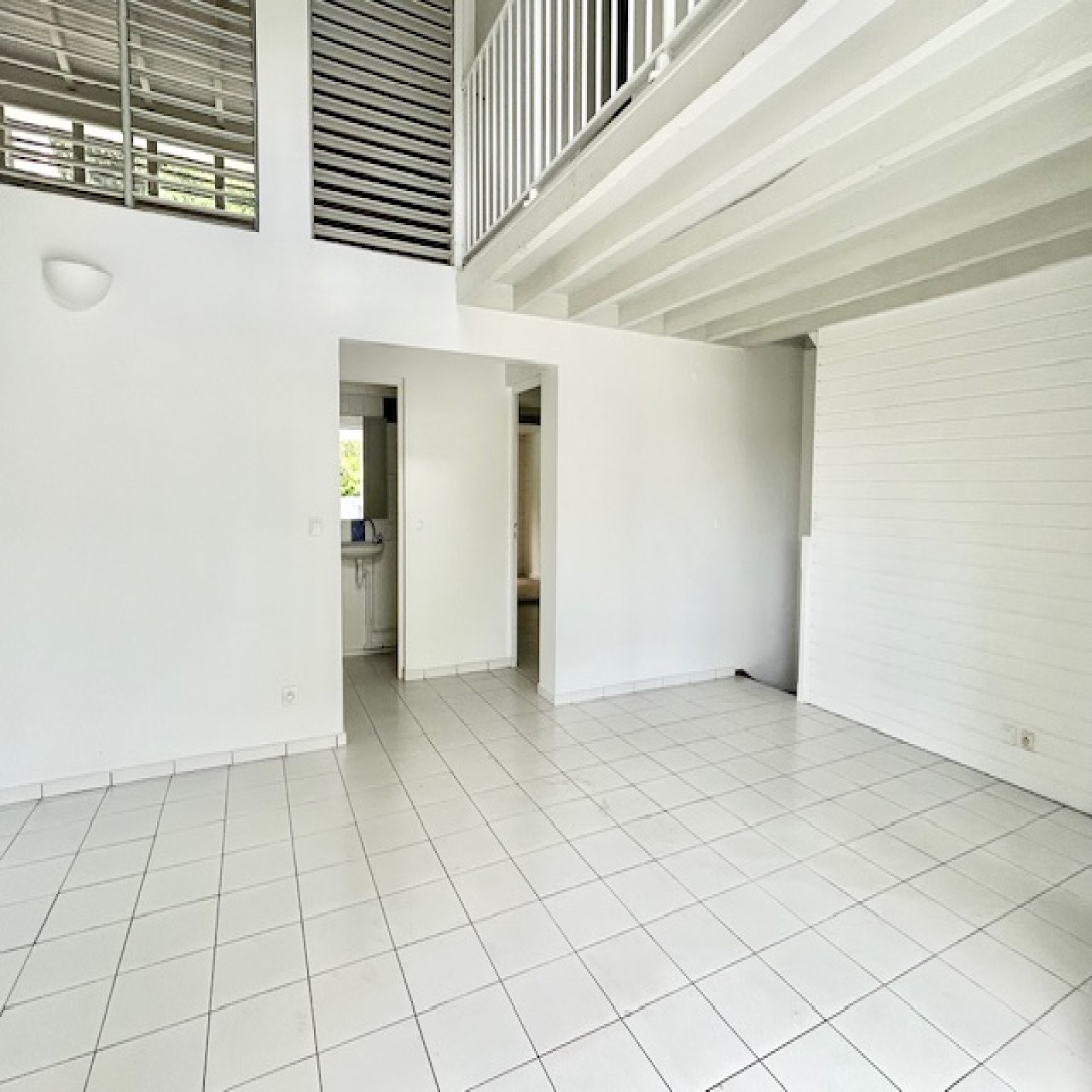- Un salon lumineux avec une belle hauteur sous plafond, créant une atmosphère spacieuse et aérée.