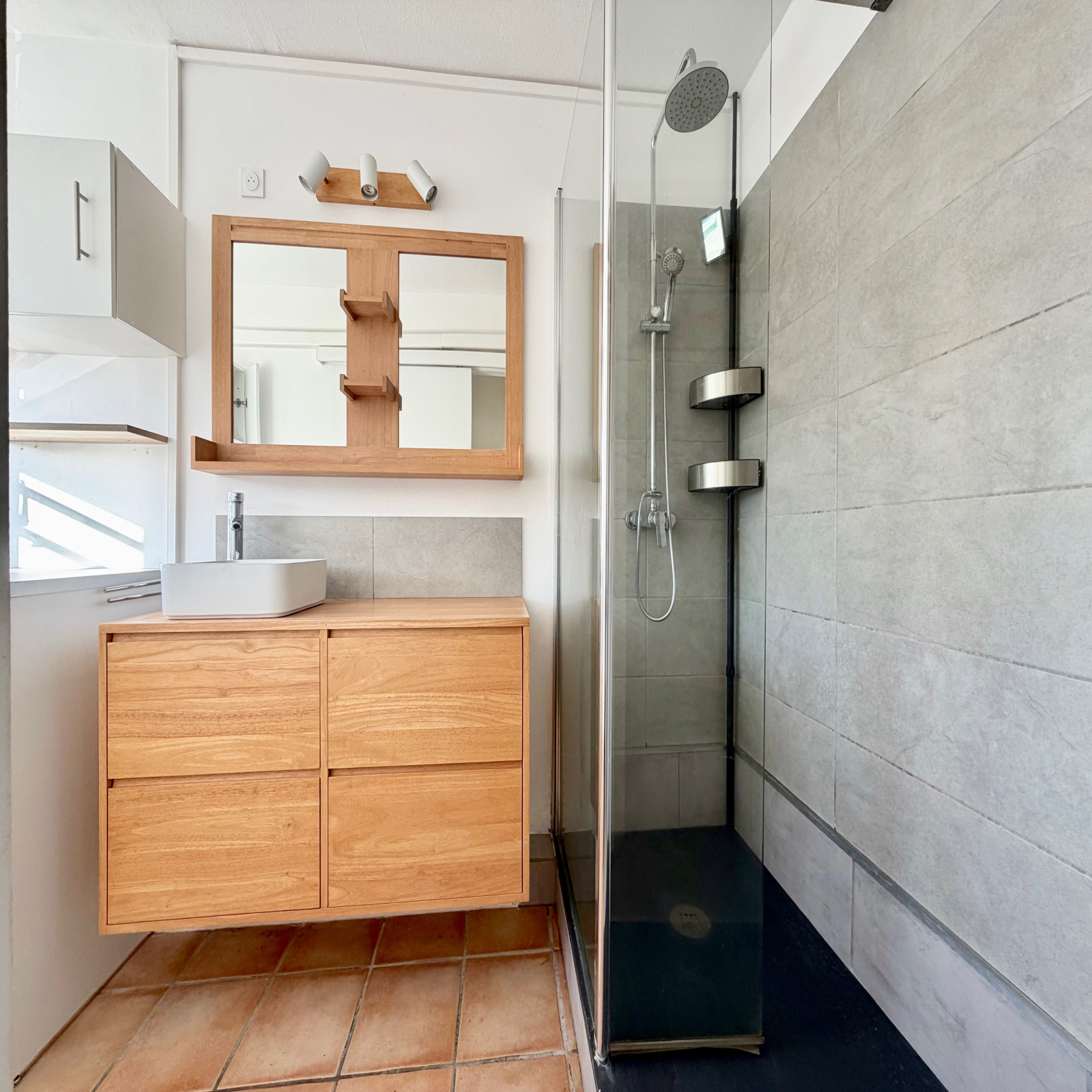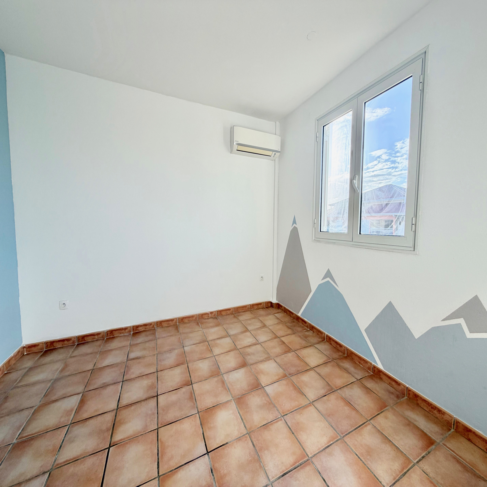L’espace nuit se compose de deux chambres climatisées, toutes deux équipées de placards, assurant confort et rangements. L’appartement dispose également d’un WC indépendant et d’une salle d’eau avec rangements.