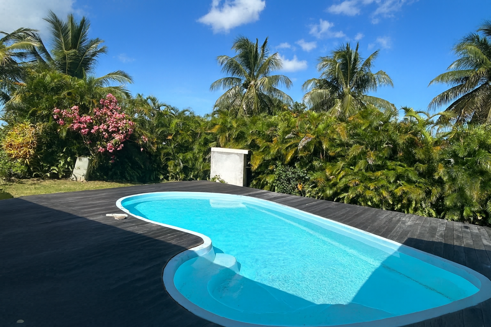 Les espaces extérieurs sont pensés pour la détente et la convivialité : une terrasse couverte ouverte sur un deck, un carbet et une piscine au sel viennent compléter l’ensemble.