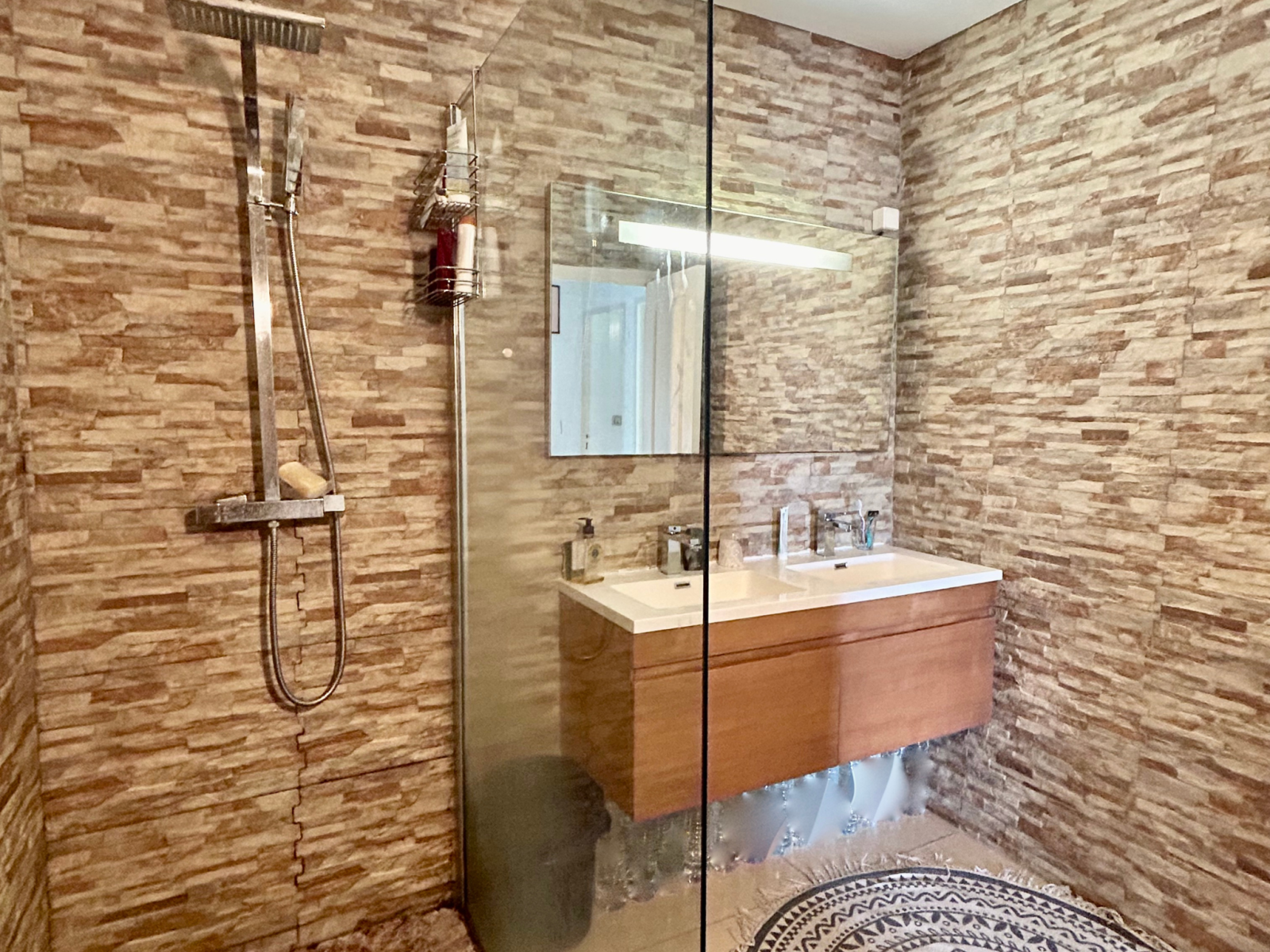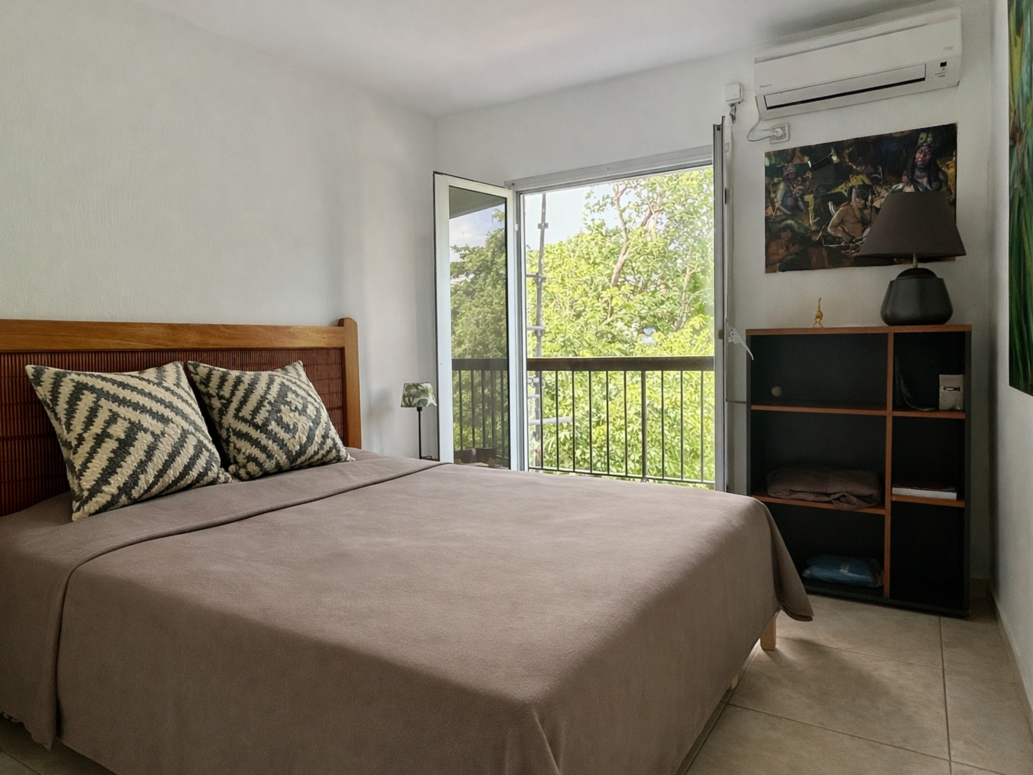 L’espace nuit comprend deux chambres climatisées, dont une avec balcon et dressing, ainsi qu’une salle d’eau commune moderne.