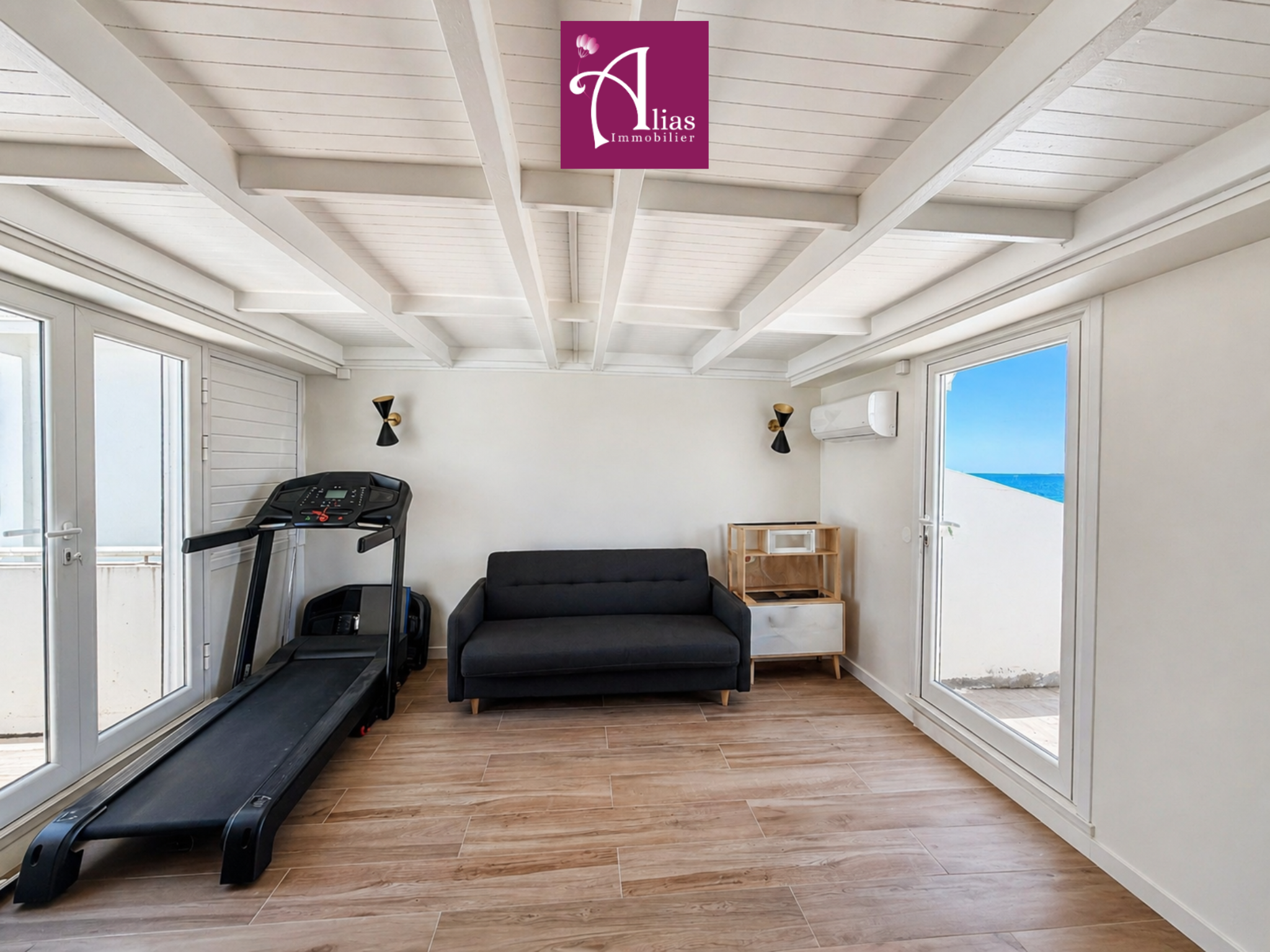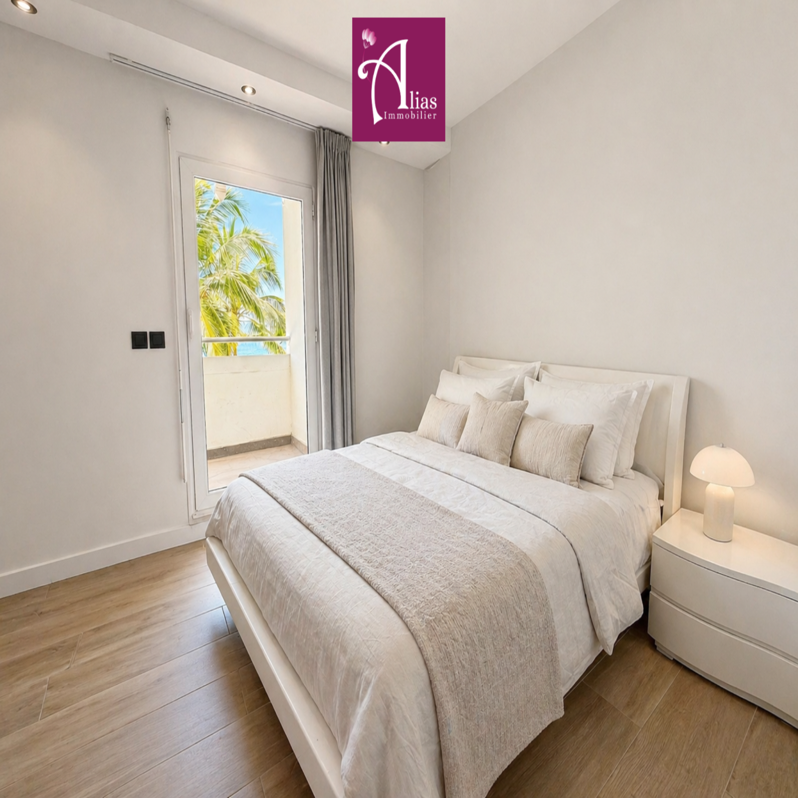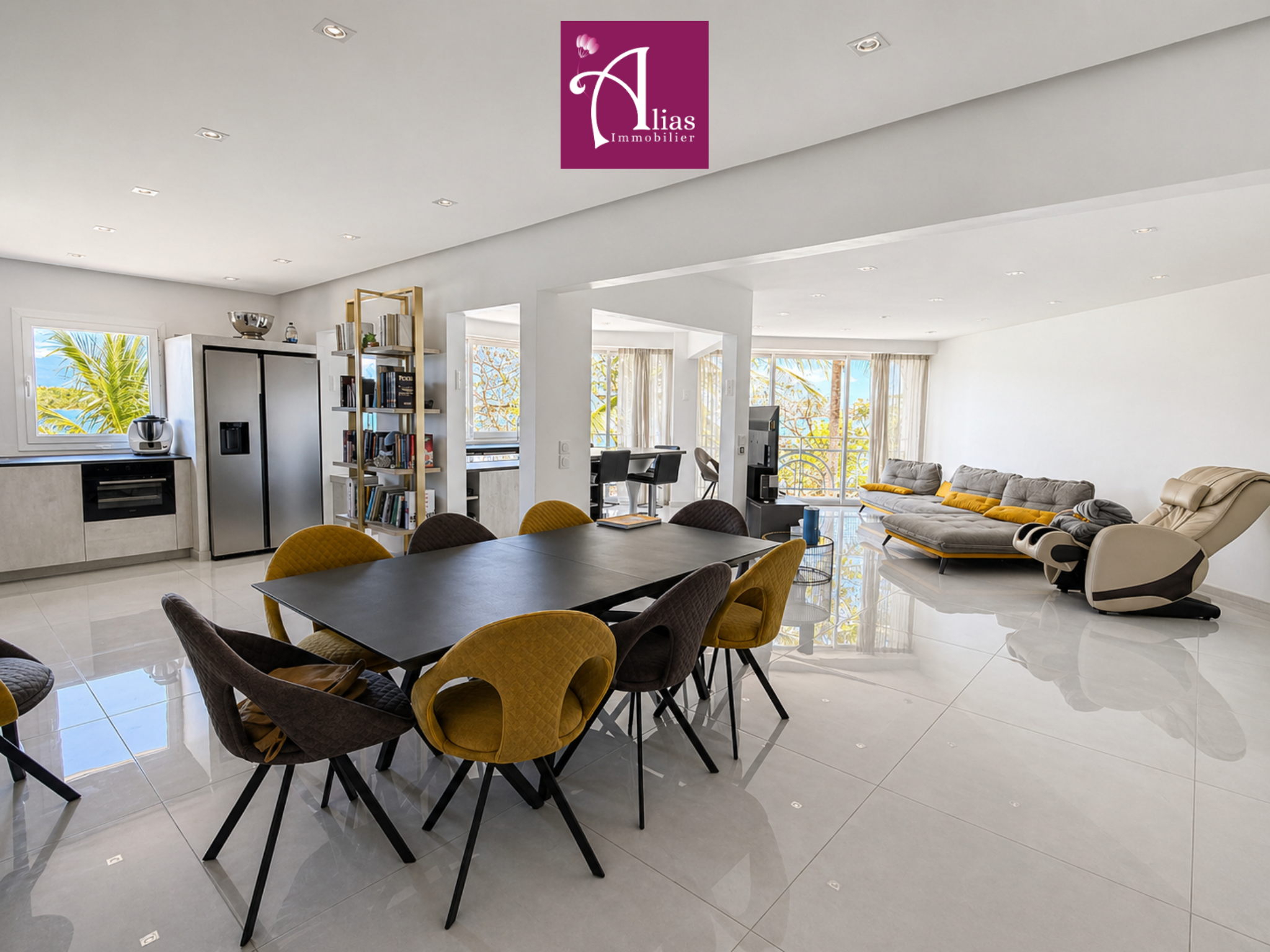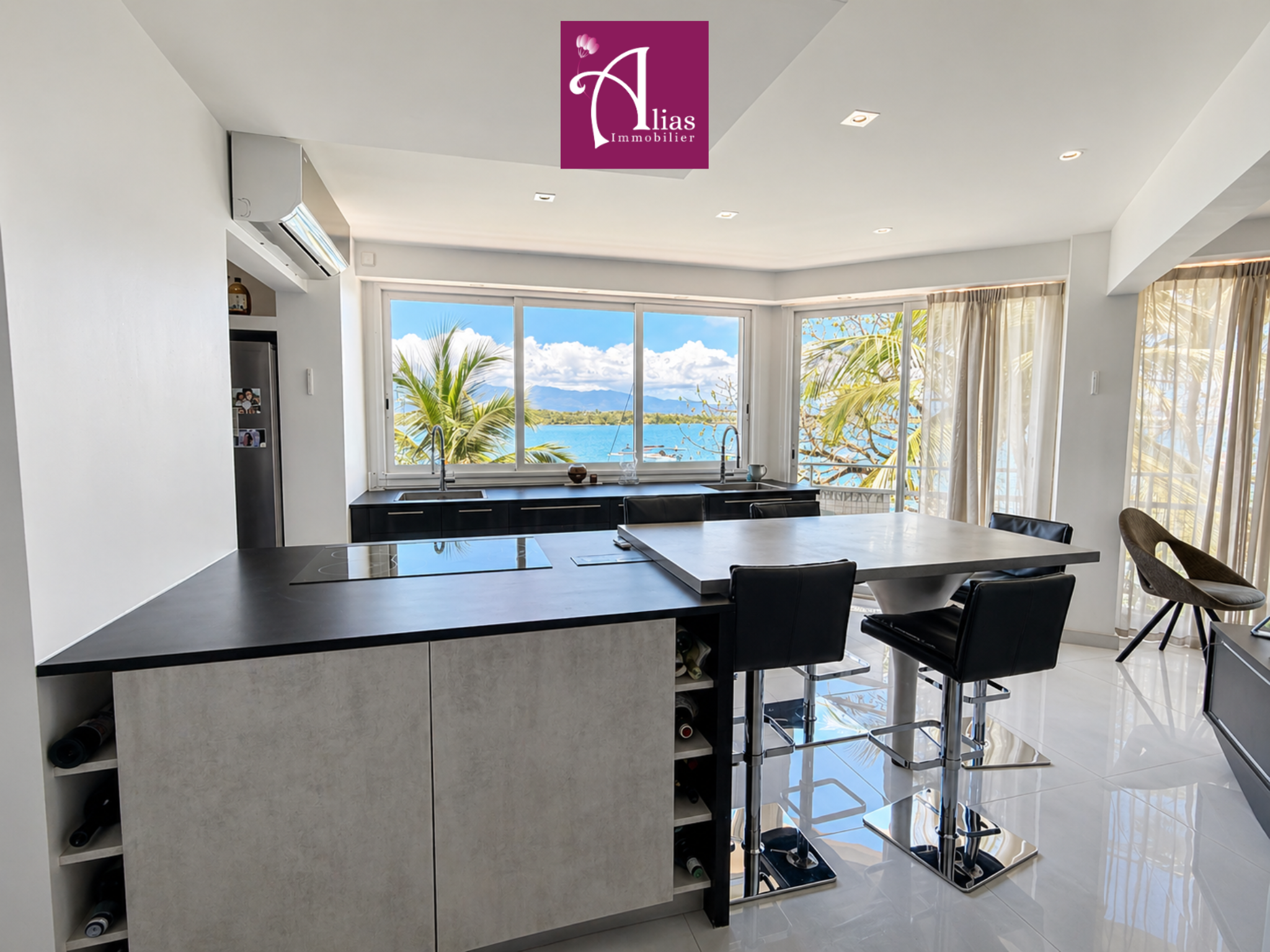 L’accès se fait par une entrée sur terrasse donnant sur la cour intérieure de la copropriété. La pièce de vie principale, entièrement climatisée, offre de beaux volumes et une luminosité remarquable. Elle se compose d’un séjour, d’un salon, d’une cuisine ouverte entièrement aménagée et équipée avec îlot central, ainsi que d’un WC invité.
