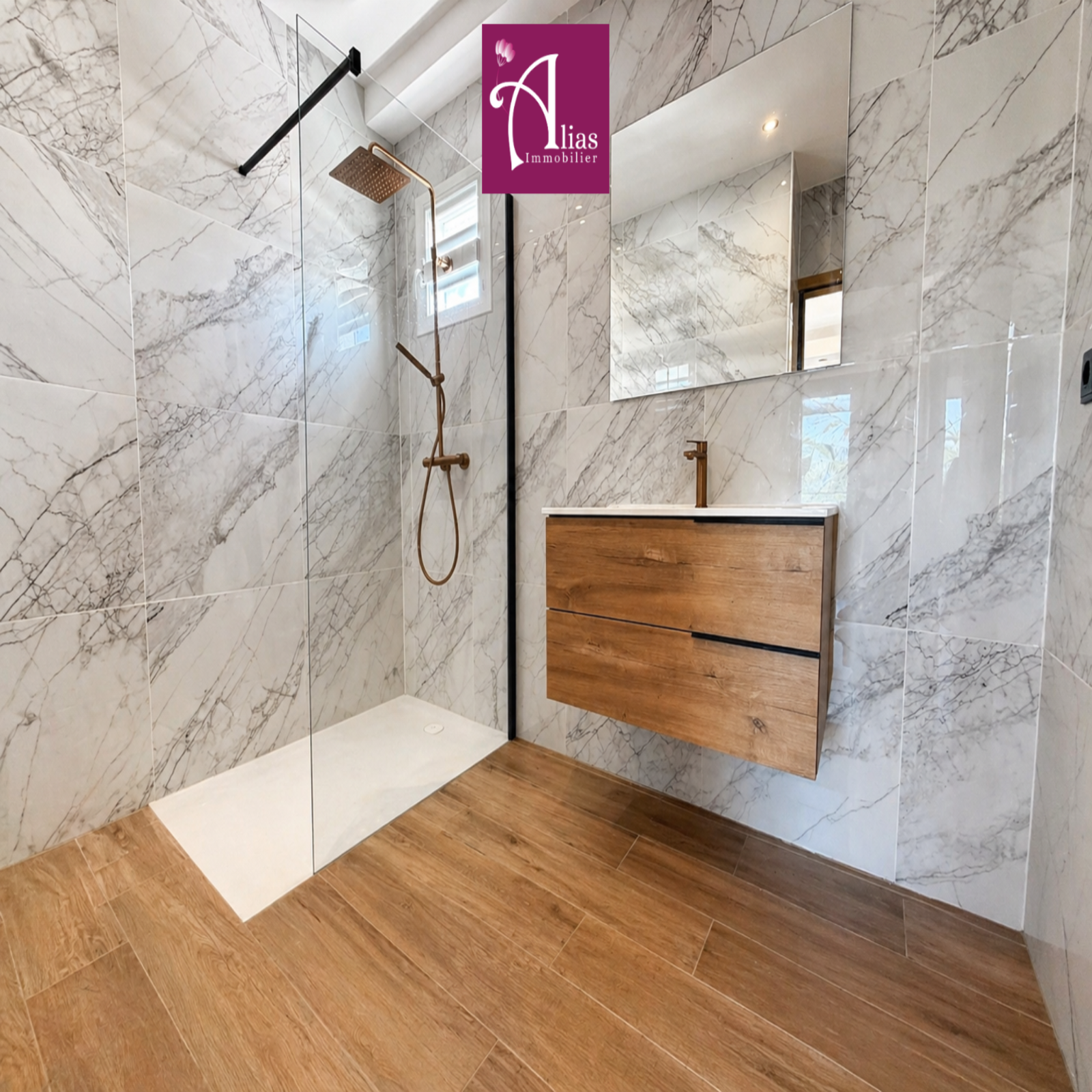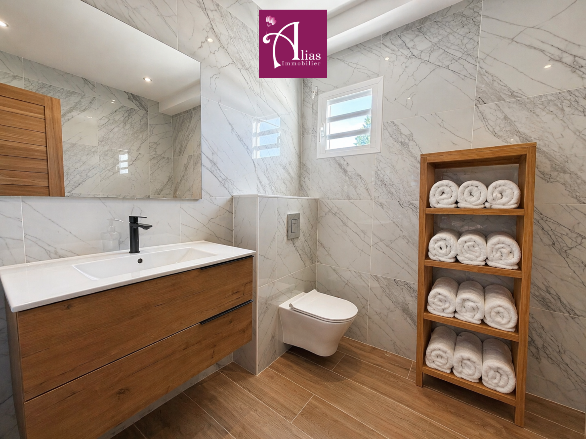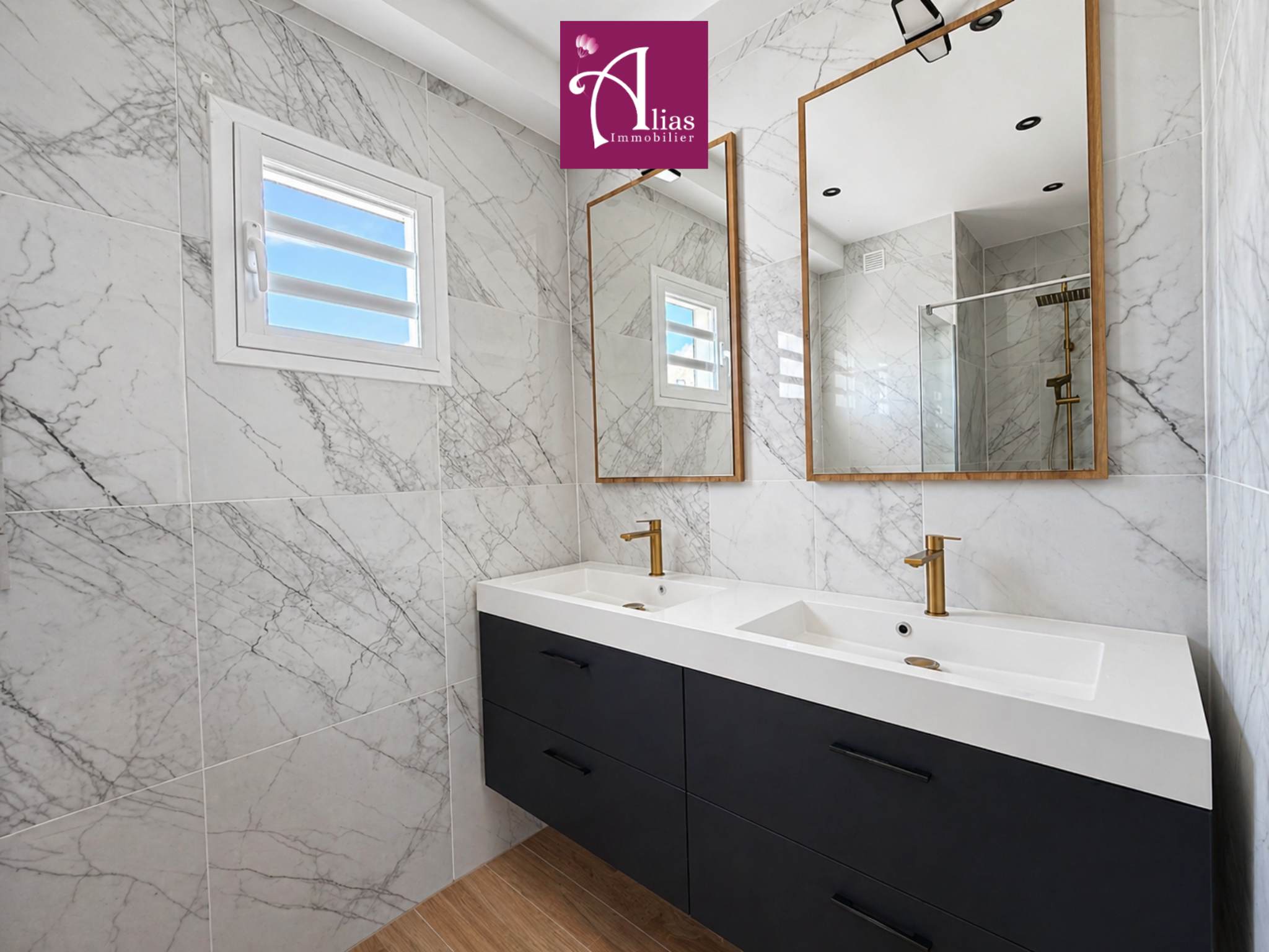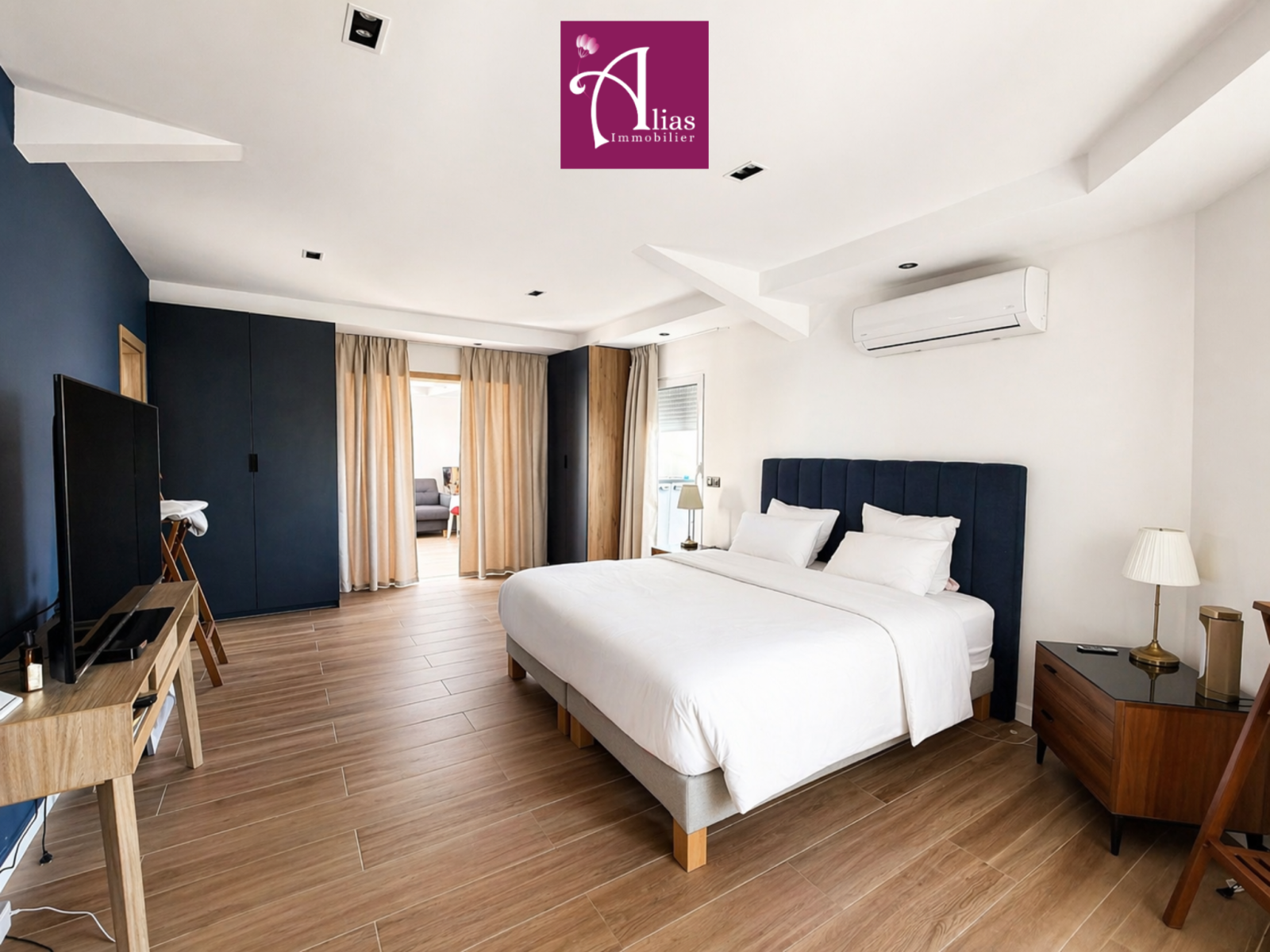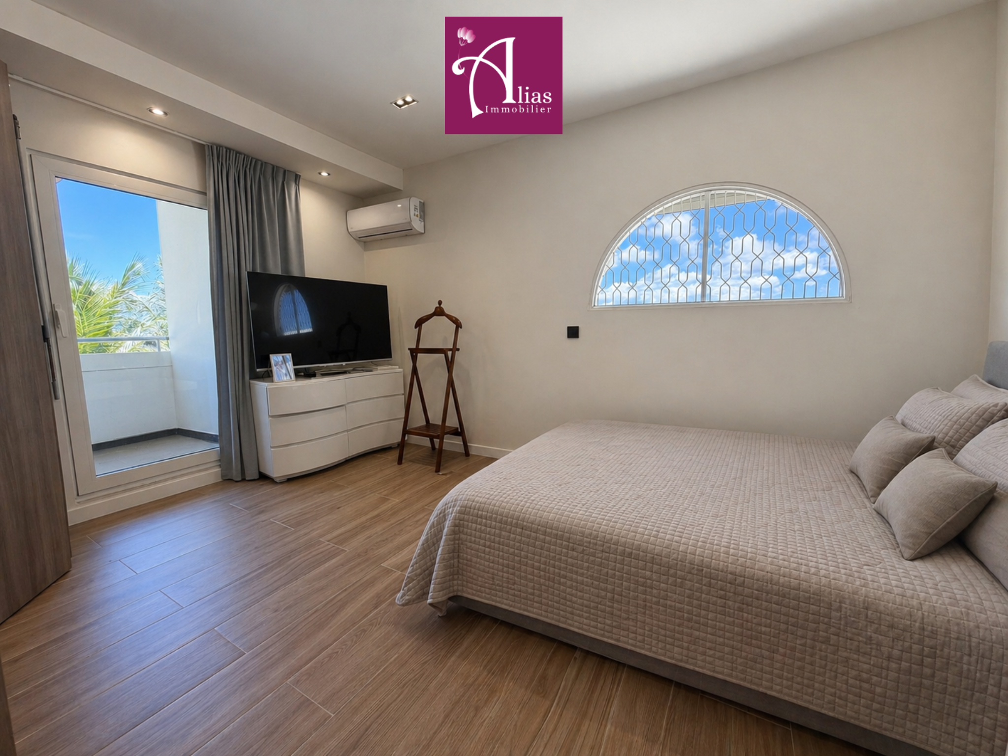 L’accès se fait par une entrée sur terrasse donnant sur la cour intérieure de la copropriété. La pièce de vie principale, entièrement climatisée, offre de beaux volumes et une luminosité remarquable. Elle se compose d’un séjour, d’un salon, d’une cuisine ouverte entièrement aménagée et équipée avec îlot central, ainsi que d’un WC invité.
